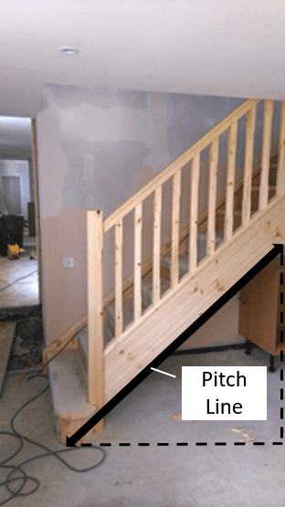 First he established and measured the 'pitch line' the staircase would need to take between the floors. In a scaled-down drawing, this line became the diagonal of a right-angled triangle (see above). From this drawing, he then figured out how many steps and spindles there would need to be, adhering as closely as possible to the 'ideal' envisioned by the architect.