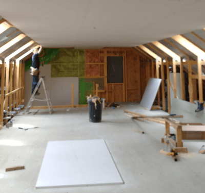 We then erected chipboard walling along the line of the attic trusses. High-quality Kingspan insulation, the most energy-efficient available, was inserted between the wall and rafters, hand-sawed onsite the ensure a perfect fit.