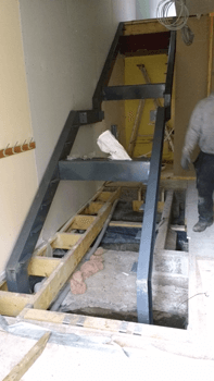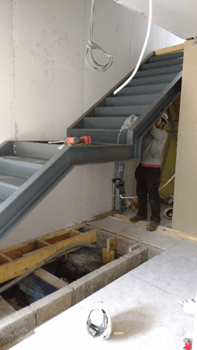 Next, came the steel staircase. Using dimensions calculated from the available space, individual steel components were manufactured, and then assembled onsite by our engineers. The stairs were extremely heavy, necessitating pad stones to be inserted between the feet and foundations.